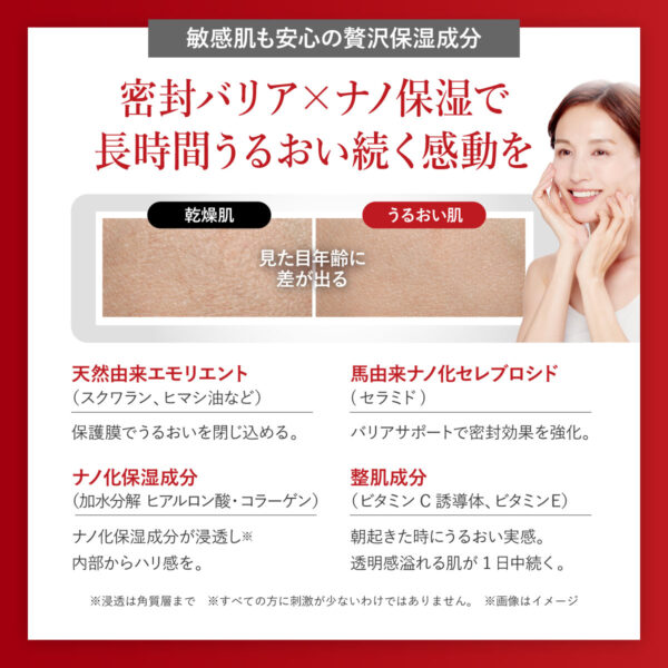 水、グリセリン、BG、スクワラン、ペンチレングリコール、イソステアリン酸水添ヒマシ油、ヘキサヒドロキシステアリン酸ジペンタエリスリチル、アルギニン、カルボマー、水添レシチン、セレブロシド、トコフェロール、加水分解ヒアルロン酸、テトラヘキシルデカン酸アスコルビル、加水分解コラーゲン、水溶性プロテオグリカン、フェノキシエタノール、香料